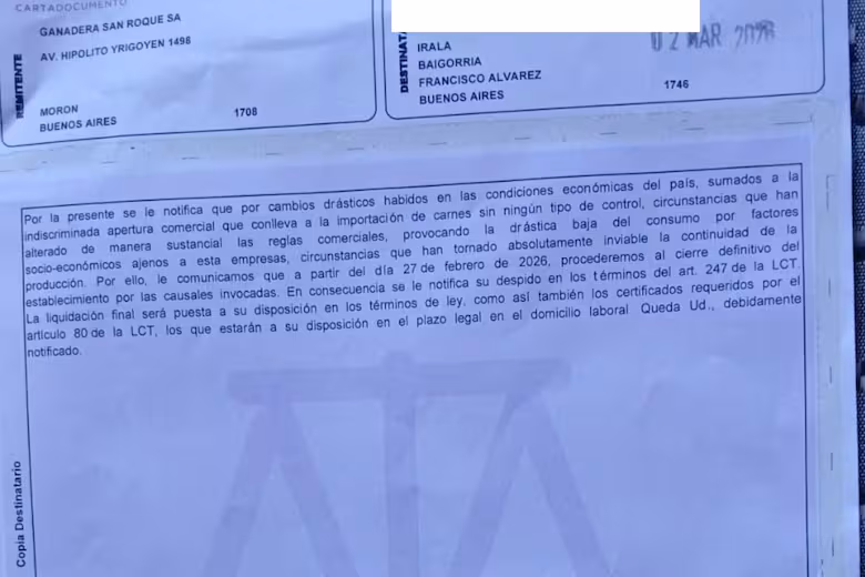El cierre se hizo efectivo el 27 de febrero y las desvinculaciones fueron encuadradas en el artículo 247 de la Ley de Contrato de Trabajo, que contempla despidos por causas económicas. En la comunicación enviada al personal, la firma aludió a “cambios drásticos en las condiciones económicas del país” y a una “indiscriminada apertura comercial que conlleva a la importación de carnes sin ningún tipo de control”, señalando que ese escenario alteró las reglas de competencia y profundizó la retracción del consumo.