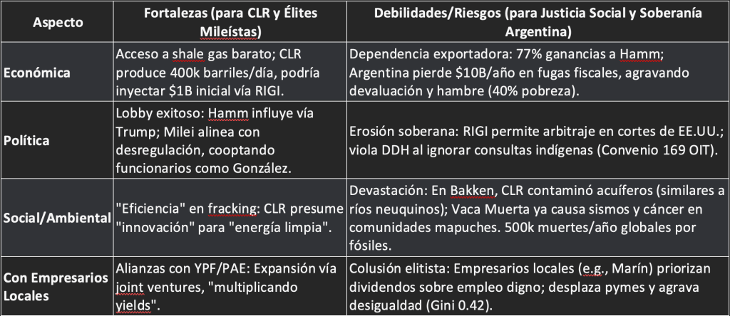 Desde una perspectiva tercermundista, invitar a CLR no fortalece a Argentina: la debilita, perpetuando el extractivismo que Milei disfraz de “libertad”. Usemos una tabla para contrastar, enfocada en impactos locales en Vaca Muerta: