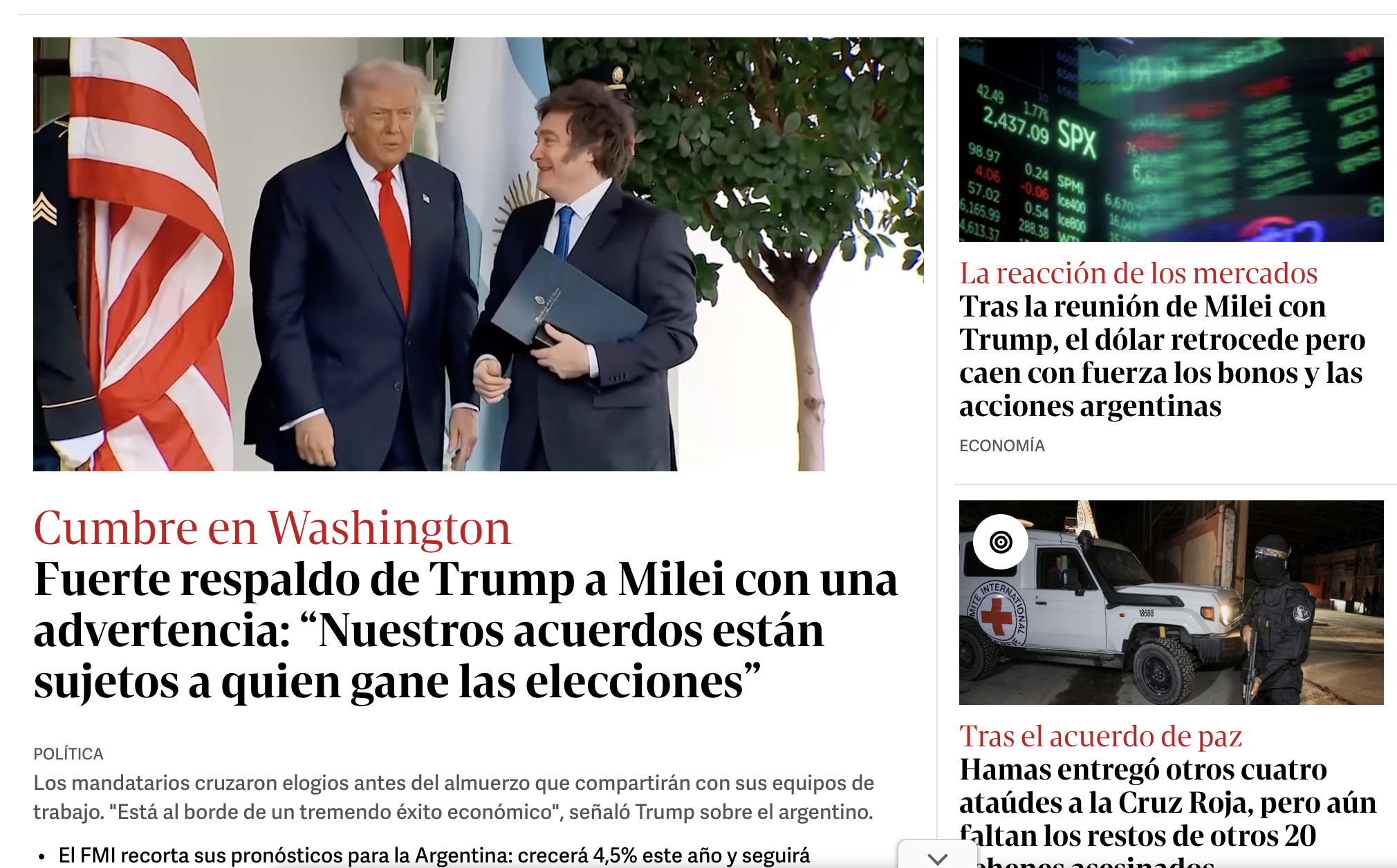 La expresidenta Cristina Fernández de Kirchner reaccionó rápido al resultado del encuentro entre el presidente Javier Milei y su par estadounidense Donald Trump, realizado este martes en Washington. A través de un posteo en la red social X, compartió una imagen de la tapa del diario Clarín, cuyo título principal señala: “Fuerte respaldo de Trump a Milei con una advertencia: nuestros acuerdos están sujetos a quien gane las elecciones”.
