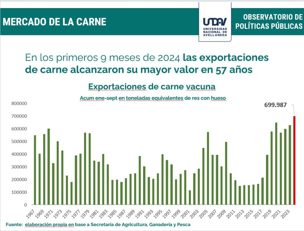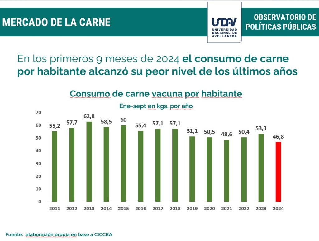 Un alarmante desplome del consumo de carne en los primeros nueve meses de 2024 se muestra como la preocupante contracara de un fuerte crecimiento de las exportaciones del sector, según se desprende de un informe del Observatorio de Políticas Públicas de la Universidad Nacional de Avellaneda (UNDAV).