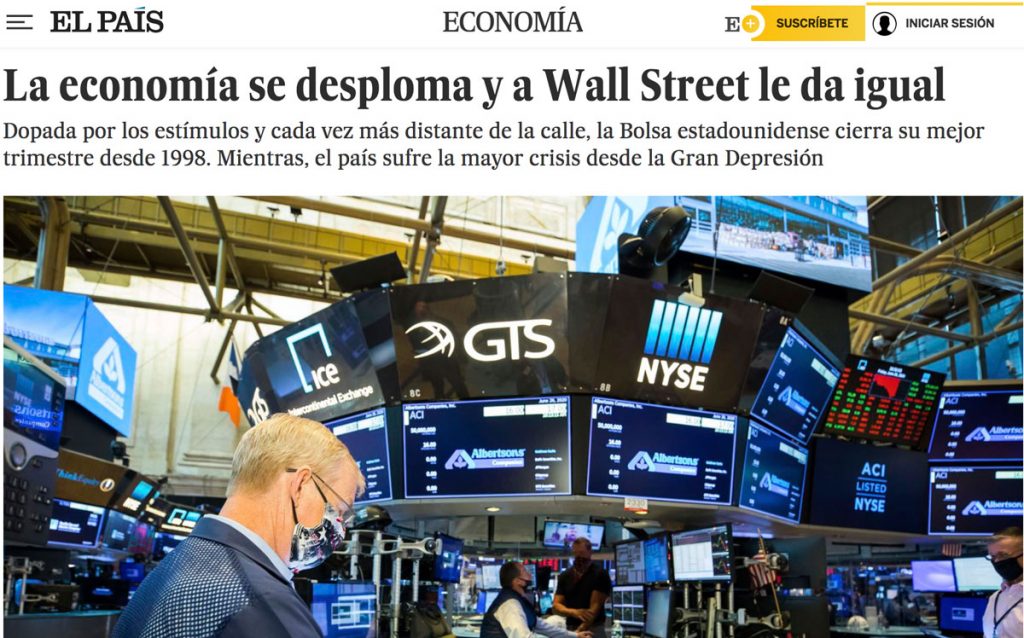 Una de ellas es la que aparece reflejada, por ejemplo, en un titular de El País, “La economía se desploma y a Wall Street le da igual”. Allí se muestra que mientras que desde febrero en Estados Unidos se perdieron unos veinte millones de puestos de trabajo (y el FMI proyecta una caída del PIB del 8% para este año), el índice bursátil que agrupa a las mayores empresas, el S&P 500, ya recuperó en el segundo trimestre casi todo lo perdido durante el anterior, siendo las acciones de las empresas tecnológicas las más beneficiadas. Todo esto da una idea de que por un lado hay un conducto por el que van la economía real, el hambre y la pobreza, mientras que por otro van la operatoria de la gran masa especulativa de dinero global y la concentración de la riqueza.