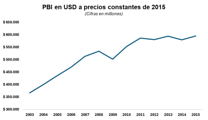 El crecimiento económico iniciado en 2003 se sustentó en un modelo que combinó dinamismo macroeconómico con una clara orientación hacia la producción nacional. Durante los primeros años, la economía creció a un promedio anual del 7,5 %, acumulando un incremento del 76 % a lo largo de los tres mandatos. Este proceso estuvo impulsado por el consumo interno, la inversión y la reactivación industrial, con la reapertura de fábricas, el fortalecimiento de las pymes y una participación activa del Estado en la recuperación de la capacidad productiva. Como resultado, el PBI en dólares pasó de 337.000 millones en 2002 a 595.000 millones en 2015.