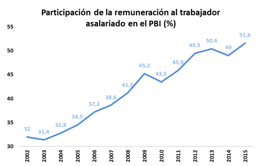 En términos distributivos, la participación de los asalariados en el ingreso volvió a niveles cercanos al 52 %, luego de haber caído por debajo del 32 % durante la convertibilidad. Este avance no fue un efecto colateral, sino una manifestación de un modelo económico que concibió, desde sus cimientos, a la distribución del ingreso como un eje estructurante. Se reinstauraron las paritarias libres, se fortaleció el salario mínimo y se protegió el empleo mediante políticas anticíclicas que apuntalaron la demanda agregada y defendieron el mercado interno ante las crisis internacionales.