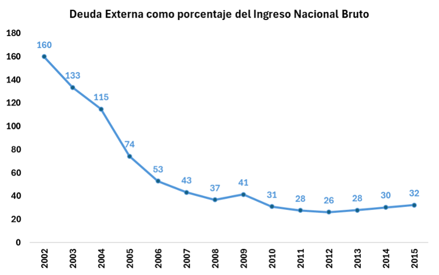 Paralelamente, la política de desendeudamiento impulsada desde 2005, con la cancelación total de la deuda con el Fondo Monetario Internacional y la reestructuración con el 93 % de los acreedores privados, permitió recuperar crecientes márgenes de soberanía económica. Esto habilitó una planificación autónoma de las políticas públicas, que se tradujo en una expansión del gasto en infraestructura, educación, salud, ciencia y tecnología, cultura y seguridad social. Entre 2003 y 2015 se construyeron más de 1.800 escuelas, se crearon 16 universidades nacionales y se federalizó el sistema científico con el fortalecimiento del CONICET y la creación del Ministerio de Ciencia, Tecnología e Innovación Productiva.
