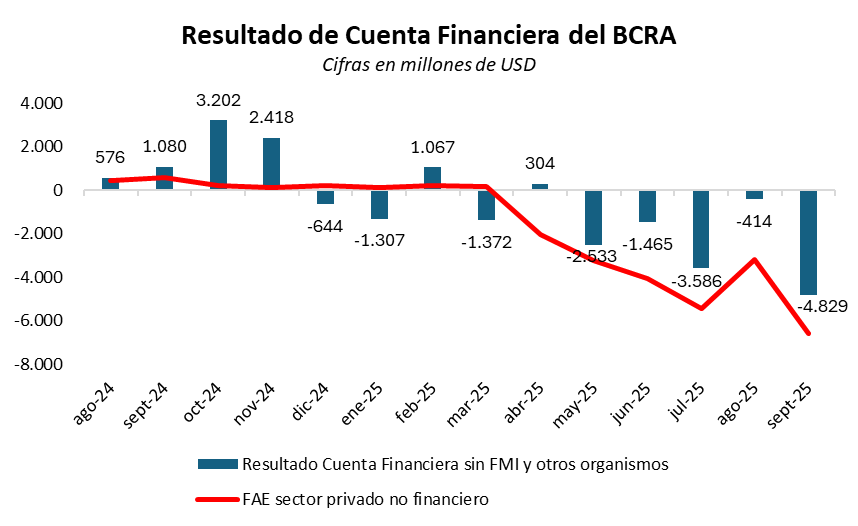 Cuando estos dos procesos se superponen (menos ingresos extraordinarios y mayor fuga por FAE) el resultado de la cuenta financiera cambia rápidamente de signo. Septiembre de 2025, con una salida neta superior a US$ 4.829 millones, es el caso más ilustrativo. Allí se observa que sin asistencia externa, los dólares que ingresaron previamente fueron compensados por la dolarización privada, obligando al Banco Central a intervenir nuevamente mediante endeudamiento o pérdida de reservas.
