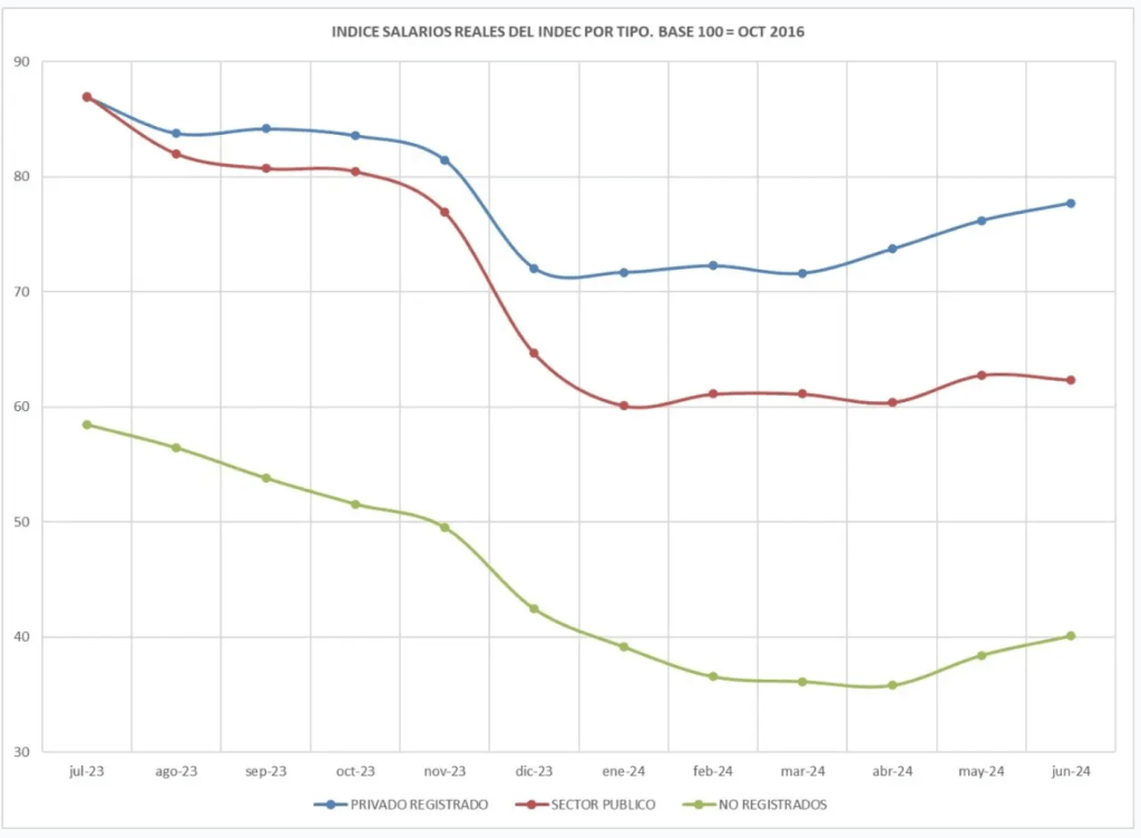 Estos datos de pérdida en la participación de los trabajadores sobre el ingreso, supusieron como se ve en el gráfico y aún durante el gobierno del FDT, una caída vertical de salarios y aumento de la pobreza de más de 20 puntos entre los años 2015 y 2023, empeoramiento récord observado aún con niveles de desempleo abierto muy bajos e incluso menores a los que dejara Cristina Kirchner.