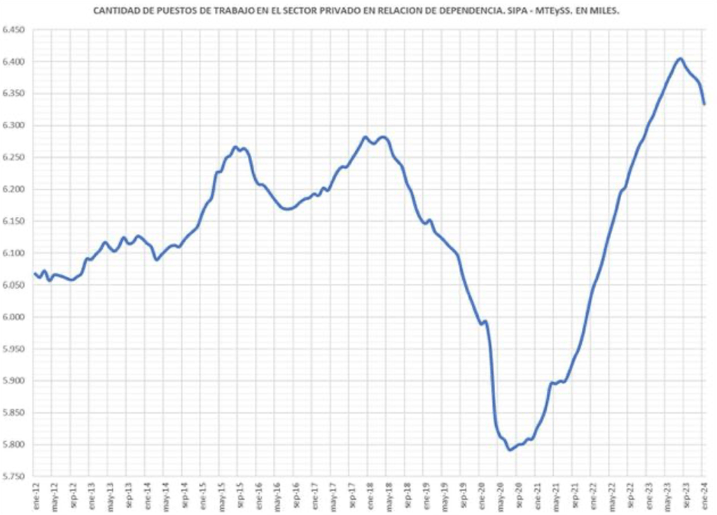 El gráfico que sigue muestra la curva descendente en la cantidad de puestos de trabajo formales a partir de enero de este año.