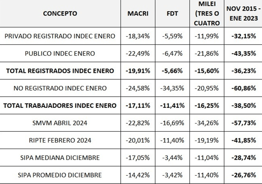 Como se observa los años de los gobiernos de Juntos por el Cambio y Frente de Todos fueron particularmente erosivos del salario de los trabajadores, con caídas que llegan al 60% en el caso de los trabajadores informales.